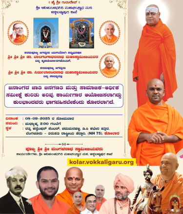 ಕೋಲಾರ ಜಿಲ್ಲೆಯ ಒಕ್ಕಲಿಗ ಸಮುದಾಯಕ್ಕೆ ಸಂಬಂಧಿಸಿದ ಮಹತ್ವದ ಸುದ್ದಿಗಳು ಮತ್ತು ಕಾರ್ಯಕ್ರಮಗಳ ಬಗ್ಗೆ ನಿಖರ ಮಾಹಿತಿ ಪಡೆಯಲು ನಮ್ಮ ಬ್ಲಾಗ್ಗೆ ಭೇಟಿ ನೀಡಿ. ಸೆಪ್ಟೆಂಬರ್ 8, 2025 ರಂದು ನಡೆಯಲಿರುವ ಸಾಮಾಜಿಕ ಮತ್ತು ಆರ್ಥಿಕ ಜಾತಿಗಣತಿ ಕಾರ್ಯಾಗಾರ ಹಾಗೂ ಸಮುದಾಯದ ಐಕ್ಯತೆಯ ಕುರಿತ ಕಾರ್ಯಕ್ರಮದ ಸಂಪೂರ್ಣ ವಿವರ ಇಲ್ಲಿ ಲಭ್ಯವಿದೆ. ಸಮುದಾಯದ ಪ್ರಮುಖರಾದ ಪರಮಪೂಜ್ಯ ನಿರ್ಮಲಾನಂದನಾಥ ಸ್ವಾಮೀಜಿ ಅವರ ದಿವ್ಯ ಸಾನಿಧ್ಯದಲ್ಲಿ ನಡೆಯುವ ಈ ಕಾರ್ಯಕ್ರಮಕ್ಕೆ ಹೆಚ್ಚಿನ ಸಂಖ್ಯೆಯಲ್ಲಿ ಭಾಗವಹಿಸಿ, ಒಕ್ಕಲಿಗರ ಐಕ್ಯತೆಯನ್ನು ಬಲಪಡಿಸಲು ಸಹಕರಿಸಿ.